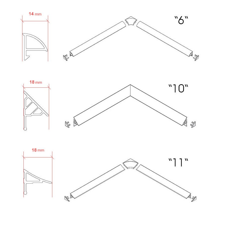 A takaró sín 10 - lezárja a hézagot 10 mm-ig. Végződéssel egészíthető ki. A sarkot 45°-os bevágással hozzuk létre.