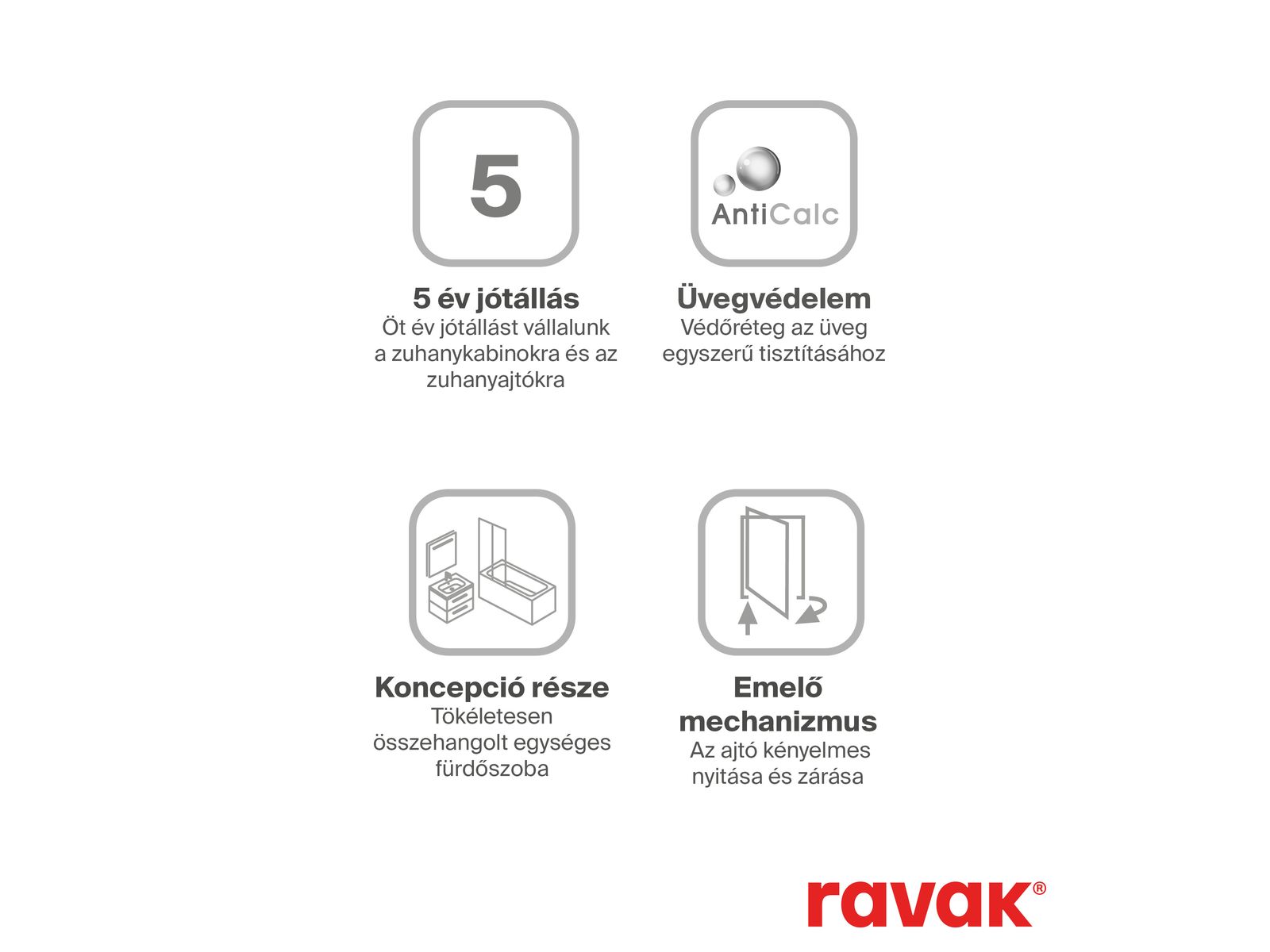 Még a legegyszerűbb víz is nyomot hagy az üvegen, ez a vízkő hatása. Az üveget a RAVAK AntiCalc® védőtechnológia védi, amely megakadályozza a vízkő lerakódását, így a takarítás könnyebb lesz.
