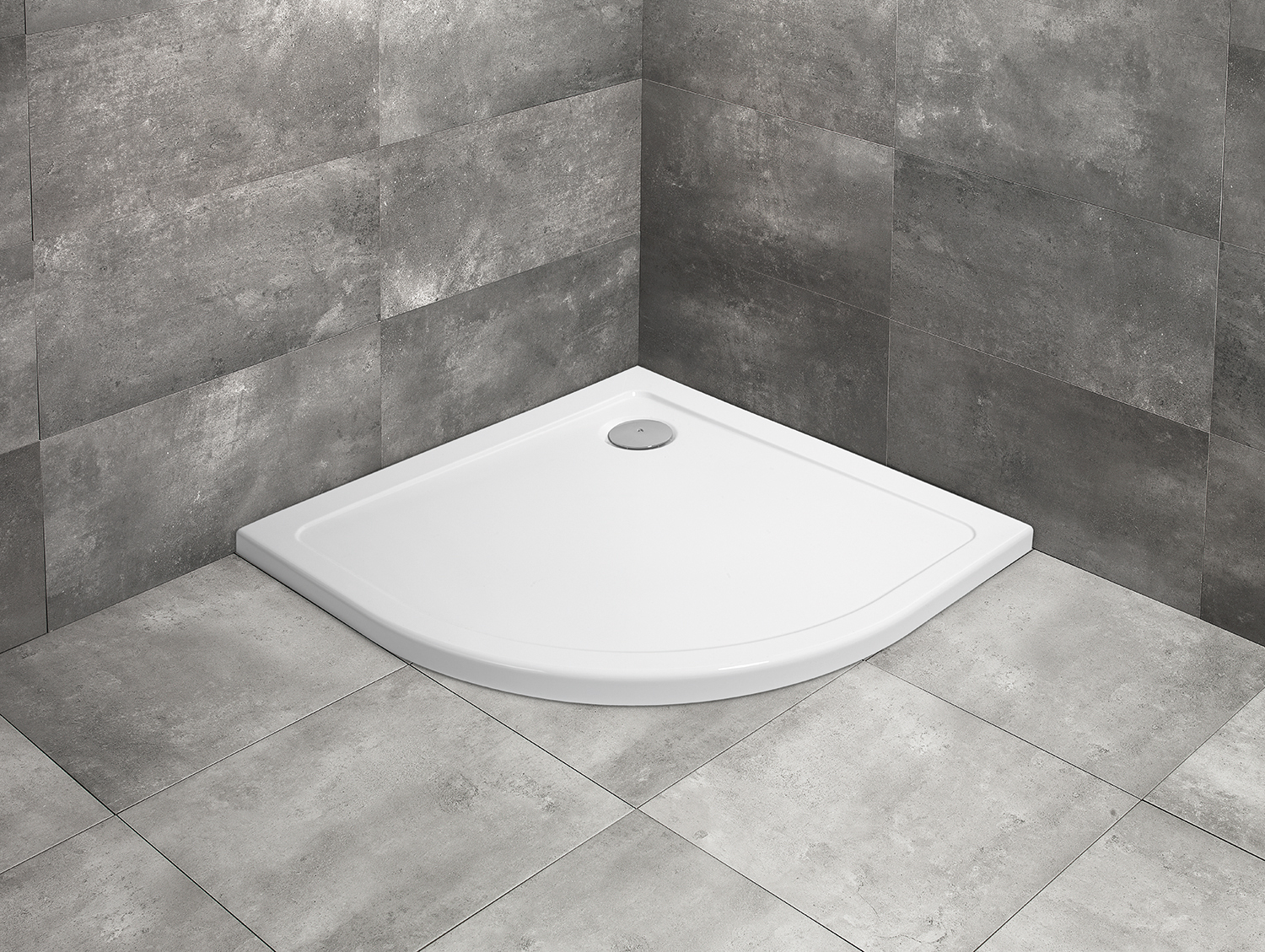Íves akril zuhanytálca, közvetlenül a padlósíkra építhető.